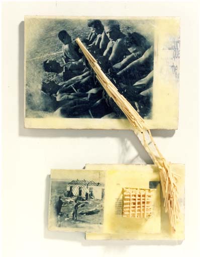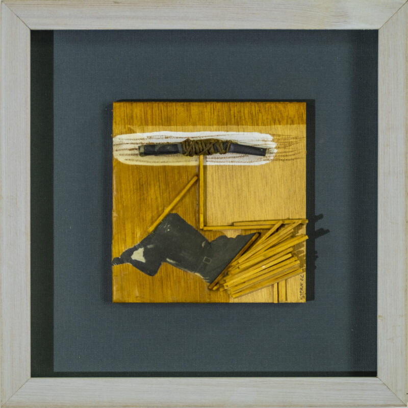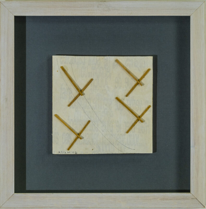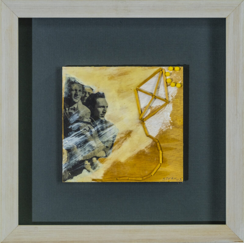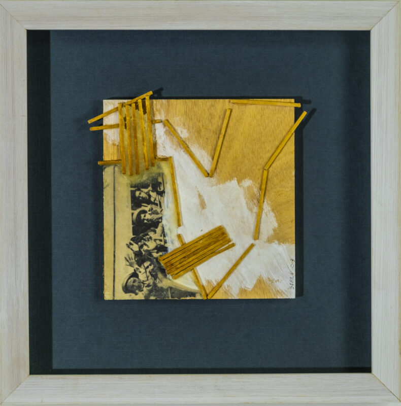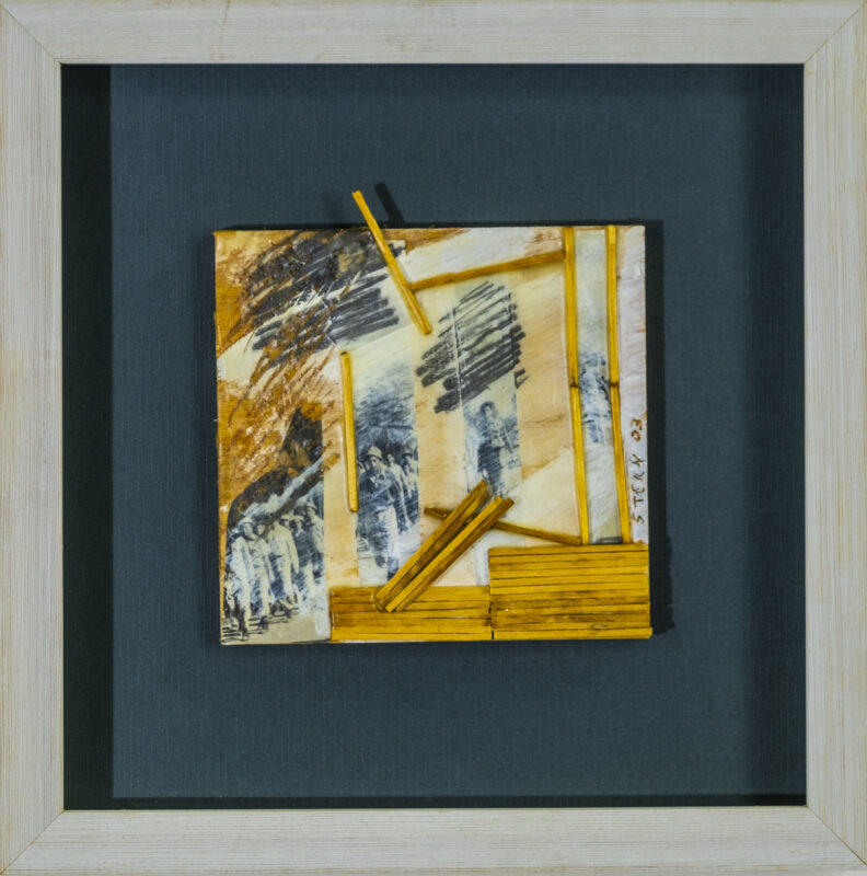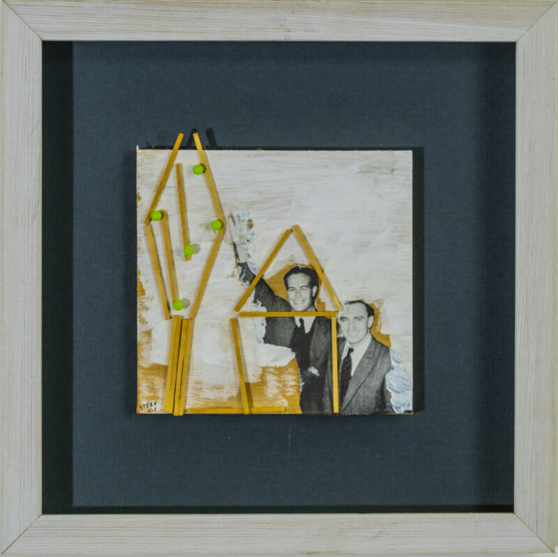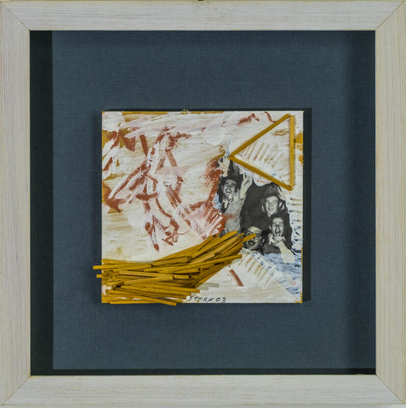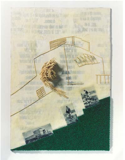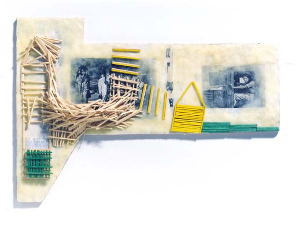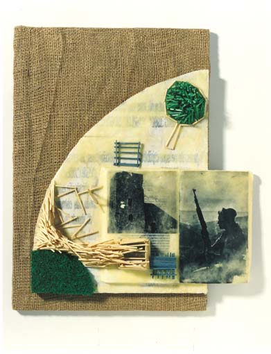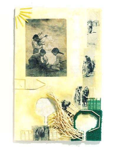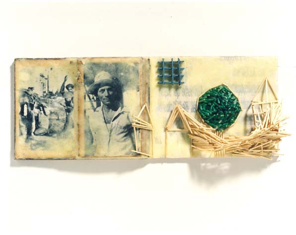 The historical photographs, all in black-and-white, serve Stern as a base for the works’ third and top layer, which transcends into the three-dimensional realm: surfaces of artificial green grass and constructions made of matches. Apparently the most concrete in relation to the other two, this plane embodies – by its very essence, and often in its “architecture” – the inner spiral typifying the course of time and consciousness, which gradually implode, returning to the past on a route of accelerated disintegration. Stern’s match towers are like a miniaturized paraphrase of the aspiration for power and control underlying the Tower and Stockade perception; an important match-system introducing the concept of the transient and temporal alongside moments of great naivety; moments of dreaming about sea and boats, houses and sun, made of matches whose heads – their vitality and burning potential – had been truncated and circumcised.